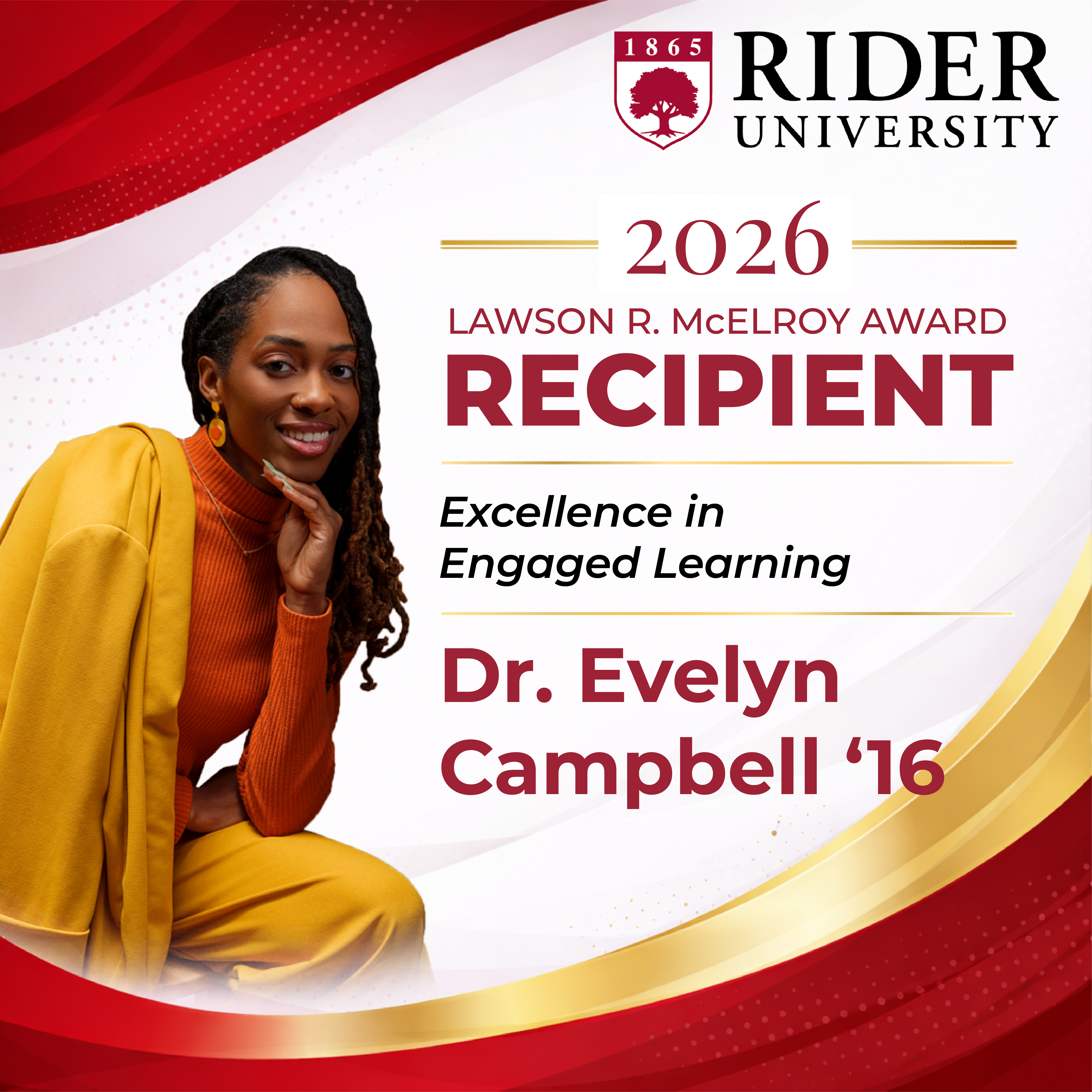 Dr. Campbell is the recipient of the 2026 Lawson R. McElroy Award for Excellence in Engaged Learning. As an educator inspired by critical pedagogues like bell hooks and Paulo Freire, Dr. Campbell embodies love and compassion in her teaching style to train empathic leaders. To date, she is the only member of Rider University's Class of 2016 to receive a university-wide Alumni Award. Click here to see all the 2026 Alumni awardees.